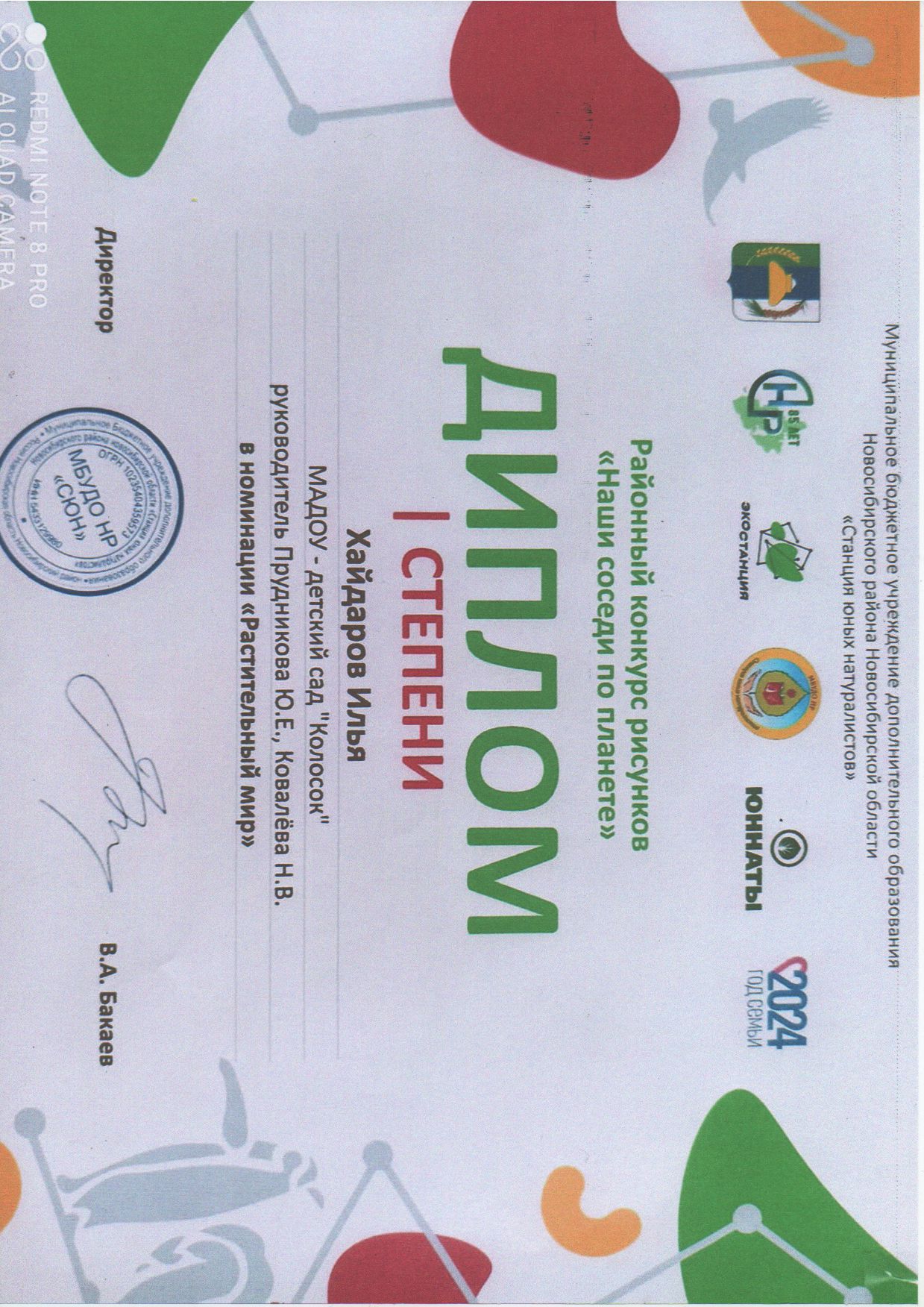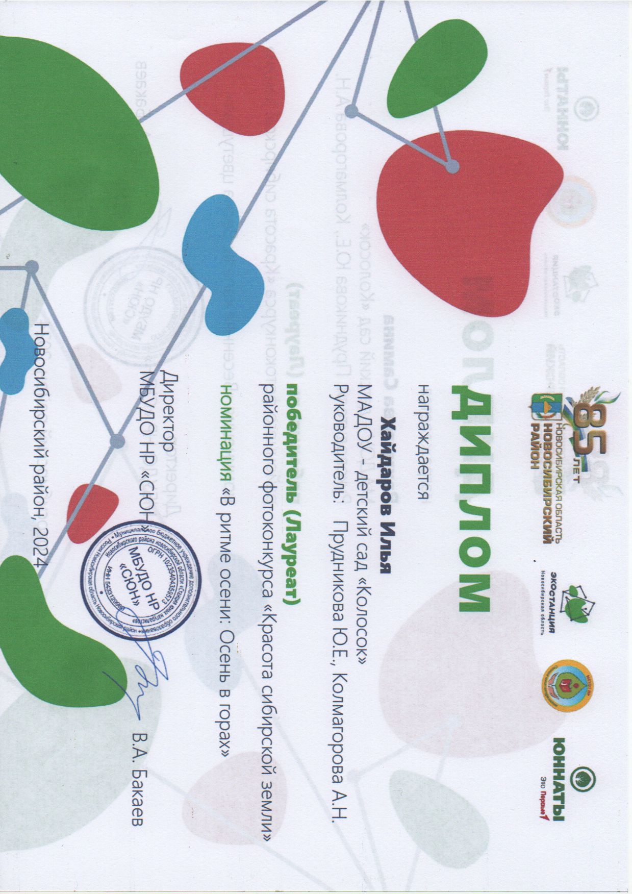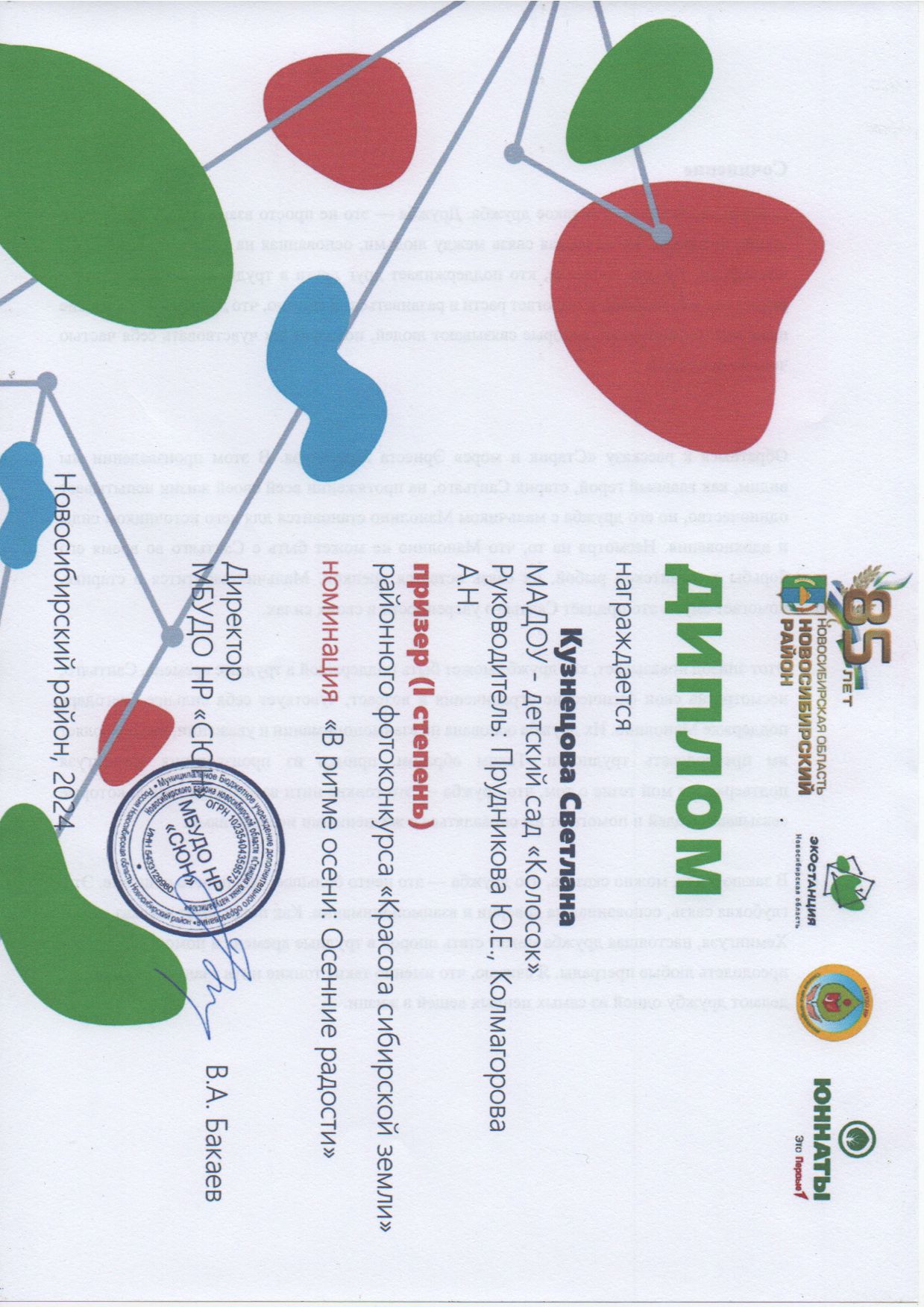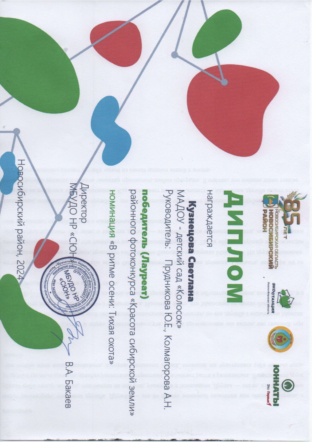 Диплом призера 1 степени за участие в районном фотоконкурсе " Красота Сибирской Земли " МБУДО НР " Станция Юных Натуралистов" в номинации " В ритме осени"