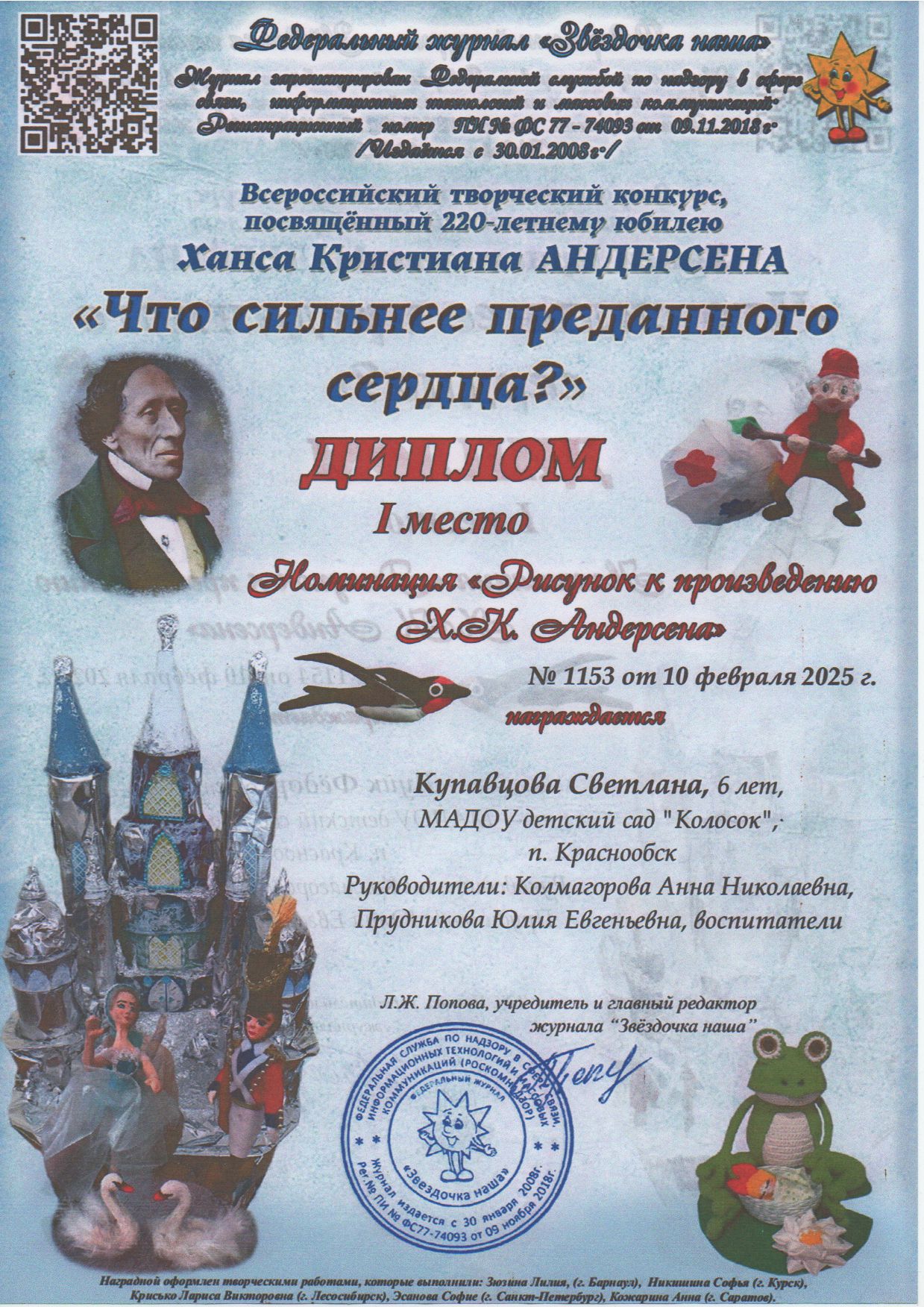 Диплом за 1 место за участие во всероссийском творческом конкурсе , посвященный 220 летнему юбилею Ханса Кристиана Андерсена Федерального журнала " Звездочка наша " Что сильнее преданного сердца ?" в номинации " Рисунок к произведению"