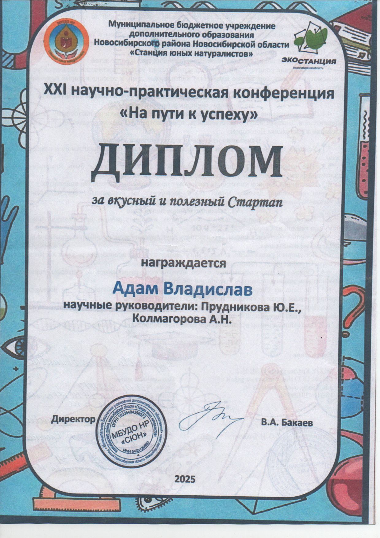 Диплом за участие в ХХI научно - практической конференции " За вкусный и полезный стартап" от МБУДО " Станция Юных натуралистов"
