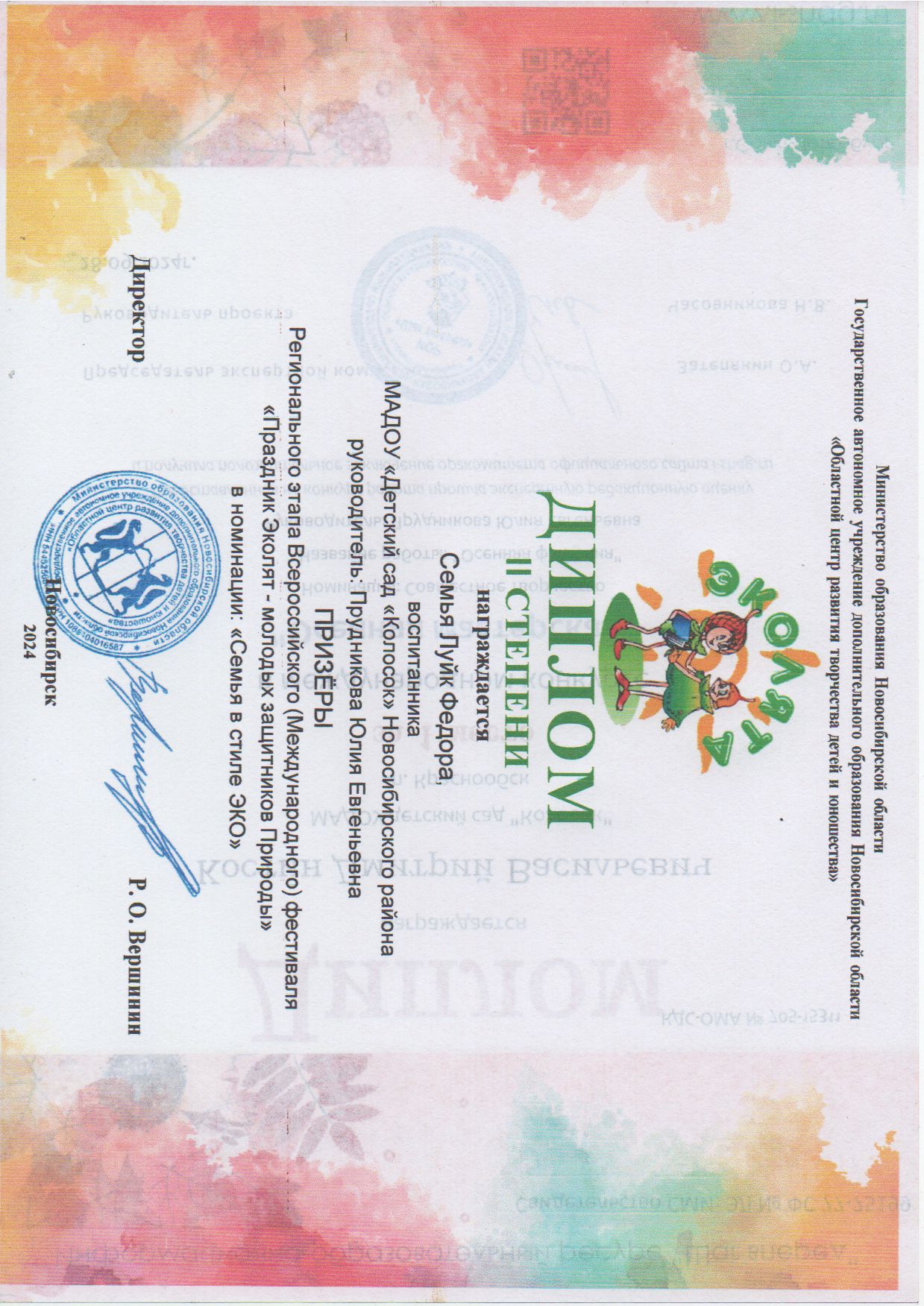 Диплом 2 степени семье Луйк призеры регионального этапа Всероссийского международного фестиваля " Праздник Эколят - молодых защитников природы " в номинации " Семья в стиле ЭКО". от Министерства образования НСО" Областной центр развития творчества детей и юношества"