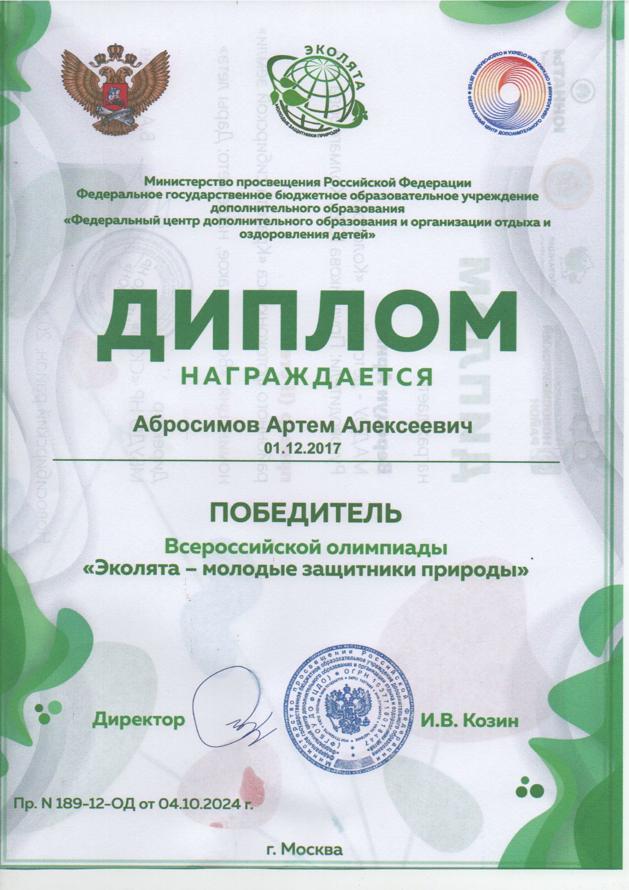 Диплом победителя Всероссийской олимпиады " Эколята - молодые защитники природы" Министерства просвещения РФ ФГБОУДО " Федеральный центр дополнительного образования и организации отдыха и оздоровления детей"