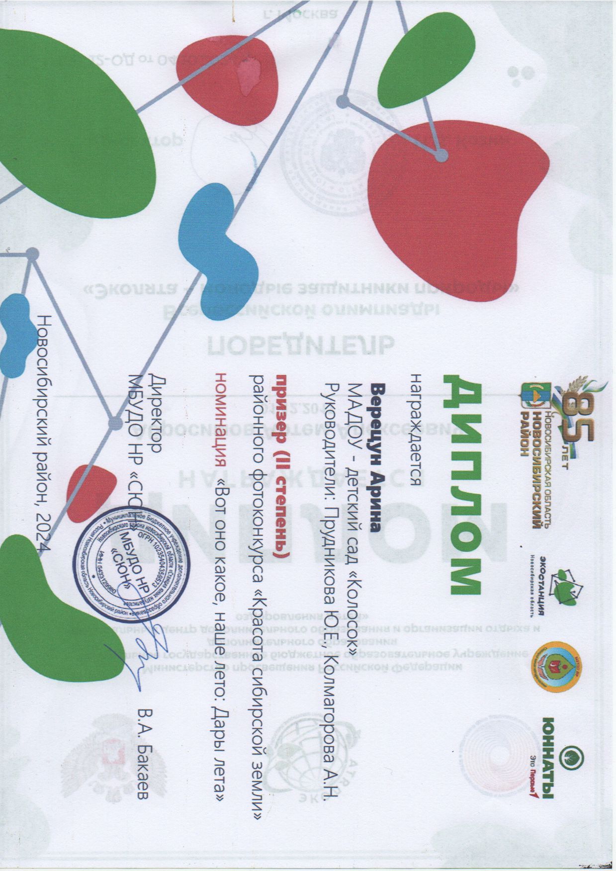 Диплом призера 2 степени за участие в районном фотоконкурсе " Красота Сибирской Земли " Станции Юных Натуралистов в номинации " Вот оно какое наше лето"