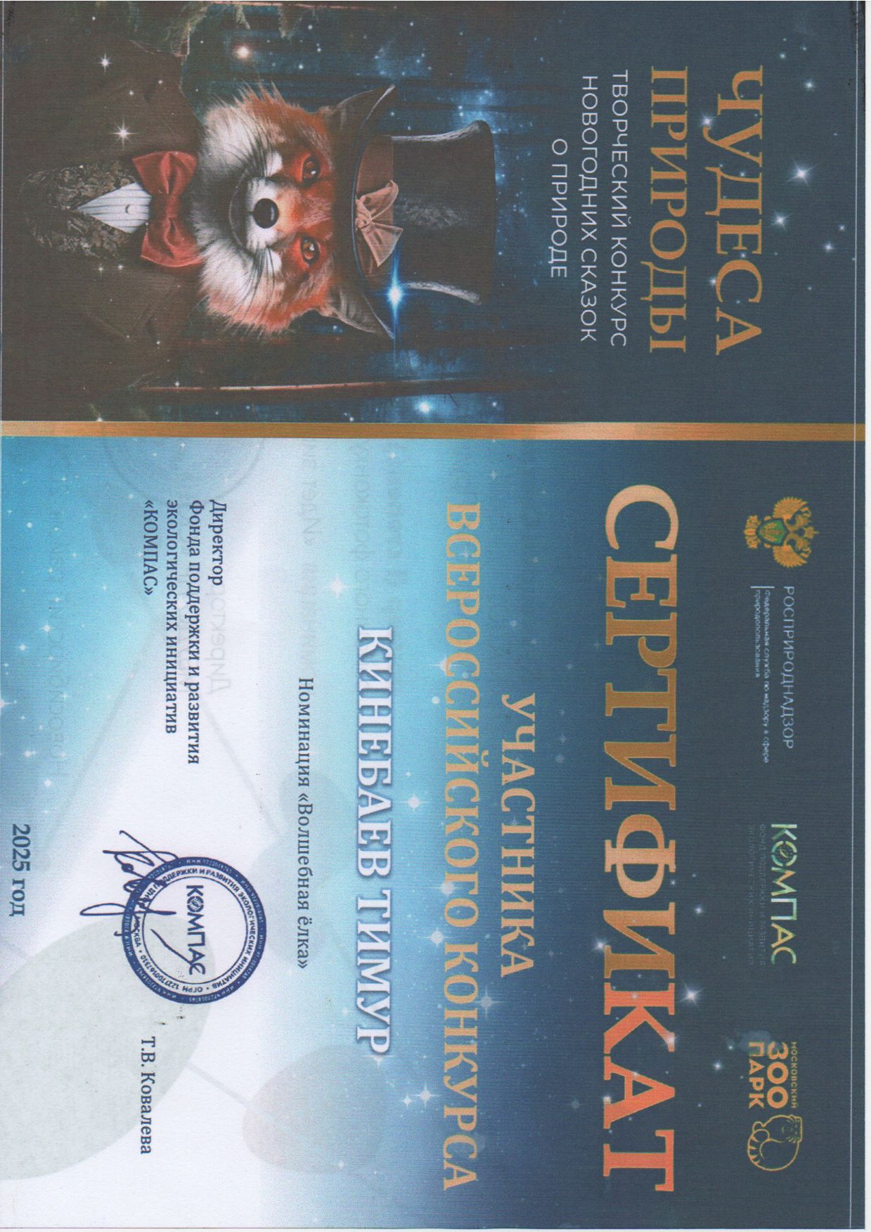 Сертификат участника Всероссийского конкурса " Чудеса природы" - Творческий конкурс Новогодних сказок о природе от Фонда поддержки и развития экологических инициатив " Компас"
