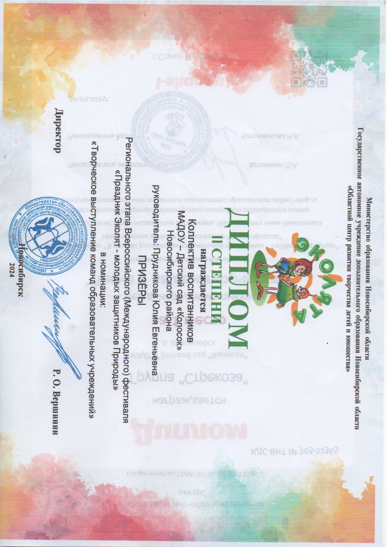 Диплом 2 степени ( Призеры) за участие в региональном этапе Всероссийского ( Международного) фестиваля " Праздник Эколят - молодых защитников природы" в номинации " Творческое выступление команд образовательных учреждений"