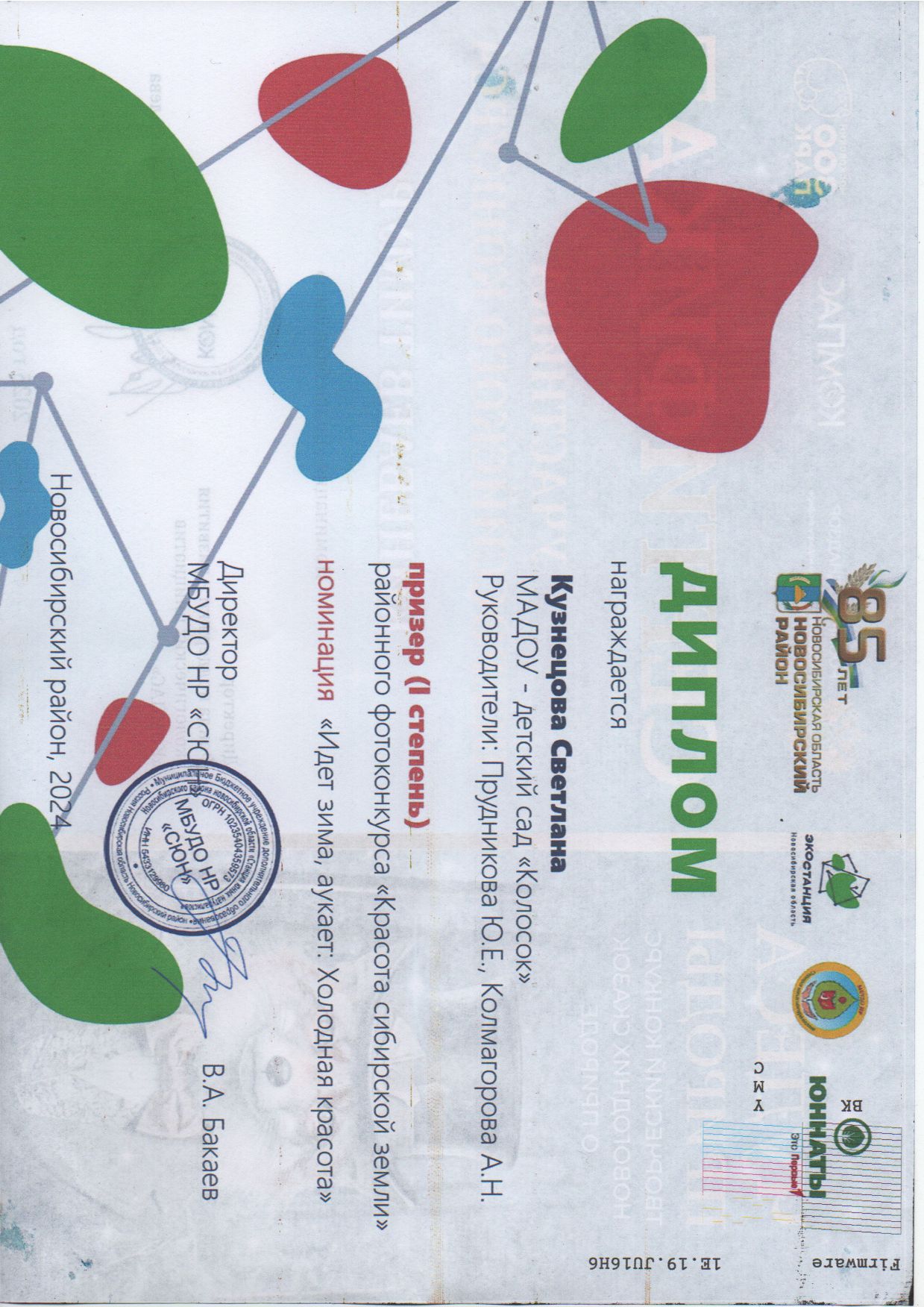 Диплом призера 1 степени за участие в районном фотоконкурсе " Красота Сибирской Земли " Станции Юных Натуралистов в номинации " Идет зима, аукает "