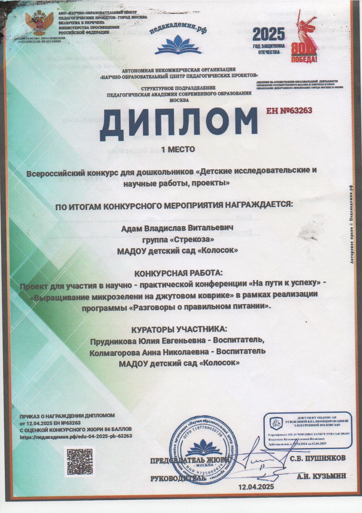 Диплом 1 место за конкурсную работу " Выращивание микрозелени на джутовом коврике " в рамках реализации программы " Разговоры о правильном питании"