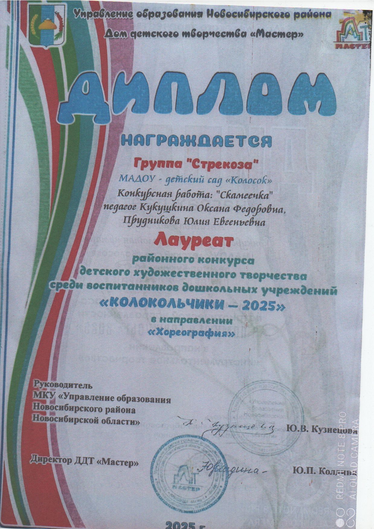 Диплом лауреата районного конкурса детского художественного творчества среди воспитанников дошкольных учреждений " Колокольчики - 2025" от ДДТ " Мастер" в направлении " Хореография" с конкурсной работой - Танец " Скамеечка"