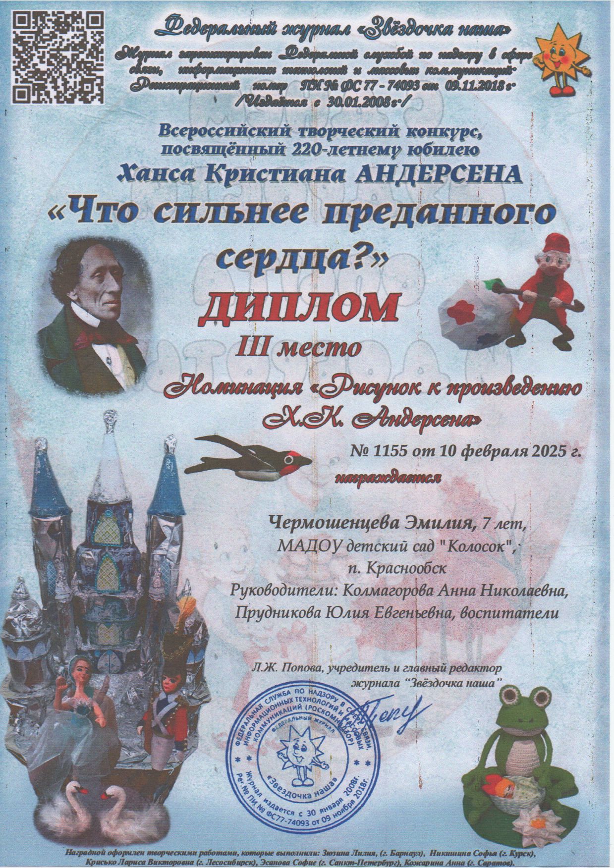 Диплом за 3 место за участие во всероссийском творческом конкурсе , посвященный 220 летнему юбилею Ханса Кристиана Андерсена Федерального журнала " Звездочка наша " Что сильнее преданного сердца ?" в номинации " Рисунок к произведению"